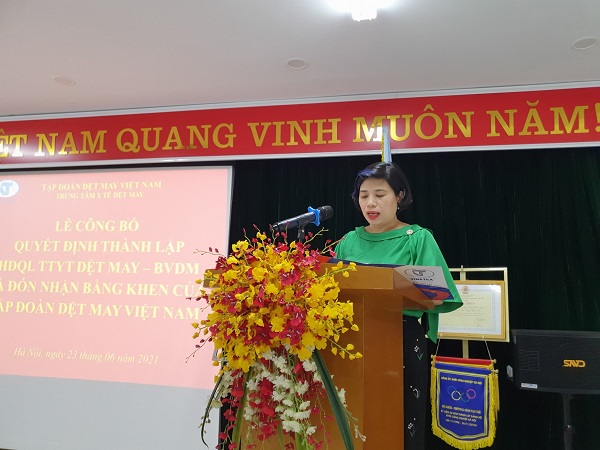 Bà Trần Thị Thu Thảo – Trưởng Ban QLNNL Tập đoàn DMVN đã đọc công bố Quyết định HĐQL Bệnh viện Dệt May gồm 9 đồng chí: Đ/c Nguyễn Đình Dũng – Thầy thuốc nhân dân, Tiến sĩ, BS, Chủ tịch HĐQT kiêm Giám đốc Bệnh viện Dệt May; đ/c Dương Trình Xuyên – Thạc sĩ, BS, Phó GĐ Bệnh viện Dệt May; đ/c Nguyễn Thị Kim Phượng – Thạc sĩ, BS, Phó GĐ Bệnh viện Dệt May; đ/c Tạ Hữu Doanh – cử nhân kinh tế, Trưởng Ban THPC Tập đoàn DMVN; đ/c Nguyễn Phước Kim Khánh – cử nhân kinh tế, Trưởng Ban KS Bệnh viện; đ/c Trần Thị Hải Vân – cử nhân kinh tế, Điều dưỡng trưởng, Chủ tịch CĐ Bệnh viện; đ/c Phạm Tuấn Anh – Trưởng Phòng tổ chức hành chính; đ/c Dương Thị Lan Phương – Thạc sĩ, cử nhân kinh tế, trưởng phòng kế toán Bệnh viện; đ/c Đinh Văn Minh – Thạc sĩ, BS, Phó khoa khám bệnh Bệnh viện.