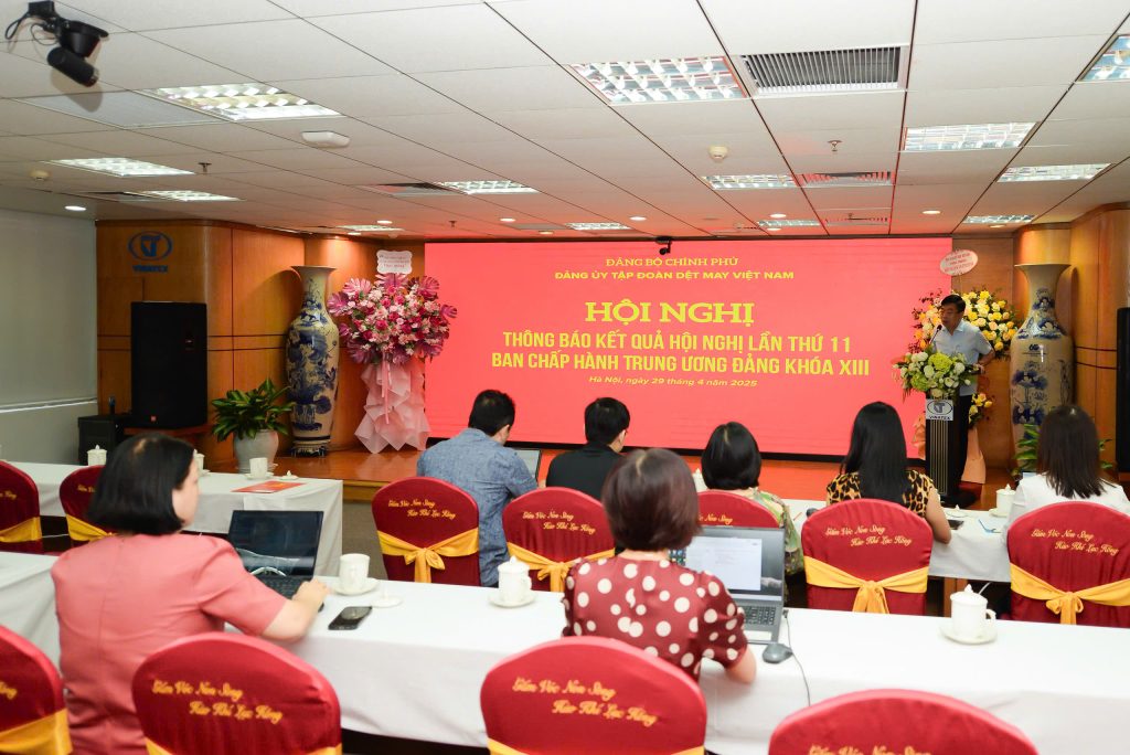 Tại Hội nghị, cán bộ, đảng viên đã nghe đồng chí Lê Tiến Trường quán triệt, phổ biến hai nội dung chính: (1) Kết quả của Hội nghị lần thứ 11 Ban Chấp hành Trung ương Đảng khóa XIII; (2) Trao đổi các giải pháp thích ứng với tình hình chính sách kinh tế, thương mại của Hoa Kỳ, đặc biệt là việc Hoa Kỳ công bố áp thuế đối ứng với hàng hóa Việt Nam, trong đó có mặt hàng dệt may – lĩnh vực gắn liền với hoạt động sản xuất kinh doanh của Tập đoàn.