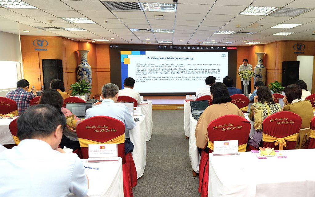 Báo cáo kết quả công tác xây dựng Đảng 3 tháng đầu năm 2025, đồng chí Nguyễn Song Hải – Phó Bí thư Thường trực Đảng ủy Vinatex cho biết, Đảng ủy Vinatex đã tổ chức triển khai đầy đủ, thực hiện nghiêm túc các chương trình, kế hoạch theo chỉ đạo của Trung ương, Đảng ủy Chính phủ. Ban hành Nghị quyết lãnh đạo chỉ đạo các mặt công tác của Đảng bộ, đặc biệt là định hướng phát triển 5 năm tới 2025-2030. Tiếp tục chỉ đạo triển khai Đề án “Tái cơ cấu Tập đoàn Dệt May Việt Nam giai đoạn 2021-2025, định hướng đến năm 2030”. Chỉ đạo tổ chức Hội nghị chuyên đề cập nhật thông tin về kinh tế, diễn biến thị trường dệt may thế giới và trong nước. Quán triệt các Đảng bộ, Chi bộ trực thuộc và các đơn vị nghiêm túc thực hiện Nghị quyết số 18-NQ/TW, ngày 25/10/2017 của Ban Chấp hành Trung ương Đảng khóa XII. Kịp thời triển khai các công tác chuẩn bị đại hội đảng bộ các cấp tiến tới Đại hội Đảng bộ Tập đoàn lần thứ IV, nhiệm kỳ 2025-2030; Chỉ đạo tổ chức thành công đại hội điểm tại Đảng bộ Trường Đại học Công nghiệp Dệt May Hà Nội. Tiếp tục xây dựng đề cương tài liệu sơ khảo lịch sử ngành công nghiệp Dệt May Việt Nam và hoàn thành phim tài liệu 30 năm thành lập Tập đoàn Dệt May Việt Nam…