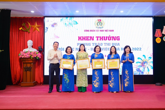 Nhân dịp này, Công đoàn Dệt May Việt Nam đã trao các giải thưởng “Giỏi việc nước – Đảm việc nhà” và trao tặng Kỷ niệm chương “Vì sự phát triển của phụ nữ Việt Nam” cho cá nhân tiêu biểu tại khu vực miền Bắc, tổ chức nói chuyện chuyên đề hướng dẫn chăm sóc da và trang điểm công sở cho gần 90 nữ đại biểu đại diện cho CBNV-NLĐ nữ toàn hệ thống.