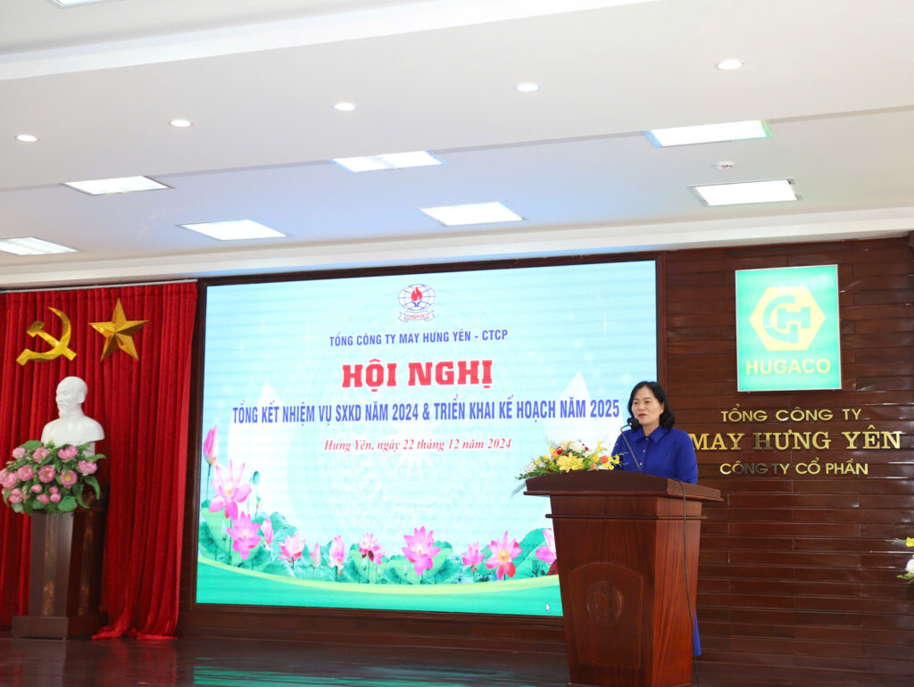 Tại Hội nghị, bà Phạm Thị Phương Hoa – Tổng Giám đốc TCT May Hưng Yên – CTCP đã trình bày báo cáo kết quả SXKD của Tổng Công ty năm 2024; phương hướng, các chỉ tiêu và giải pháp trong năm 2025. Năm 2024, mặc dù phải đối mặt với nhiều khó khăn, thách thức trước biến động của thị trường, chi phí phục vụ hoạt động SXKD tăng cao, lực lượng lao động trực tiếp giảm… nhưng lãnh đạo Tổng Công ty đã thực hiện quyết liệt, triệt để hàng loạt giải pháp nhằm ổn định và đẩy mạnh hoạt động SXKD; cải thiện điều kiện làm việc, đời sống cho NLĐ. Dự kiến, May Hưng Yên đạt doanh thu 675 tỷ đồng, bằng 98% so với năm 2023; Lợi nhuận trước thuế 72 tỷ đồng, bằng 85% so với năm 2023; Thu nhập bình quân đạt 11,6 triệu đồng/người/tháng, bằng 105% so với năm 2023; Chi trả cổ tức dự kiến 20%…