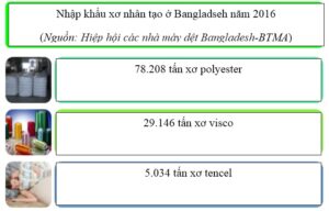 Nhập khẩu Tencel, một loại sợi làm từ thân cây và lá ở mức 5.034 tấn năm 2016 và năm ngoái là 6.199 tấn. Ông Monsoor Ahmed, thư ký của BTMA cho biết, việc nhập khẩu xơ nhân tạo đang tăng lên hàng năm. Theo các nhà dệt may, độ bền và tuổi thọ của sợi nhân tạo cao hơn sợi và vải làm từ bông. Đó là lý do tại sao nhu cầu cho các mặt hang sợi nhân tạo đang tăng lên. Nếu quần áo làm từ sợi nhân tạo không được giặt trong nhiều ngày, chất lượng của chúng sẽ không bị giảm hoặc việc giặt quá nhiều cũng sẽ không làm giảm chất lượng. Bangladesh đã nhập khẩu 78.208 tấn xơ polyester trong năm 2016, tăng 11,39% so với 70,209 tấn năm 2015 và tăng 35,72% so với 51.729 tấn trong năm 2014, theo dữ liệu từ Hiệp hội các nhà máy dệt Bangladesh (BTMA).Việc nhập khẩu sợi viscose được ghi nhận ở mức 29.146 tấn trong năm 2016, giảm nhẹ so với 29.538 tấn năm 2015. Từ tháng 1 đến tháng 6 năm 2017, khối lượng nhập khẩu là 16.063 tấn. Trong năm 2014, Bangladesh đã nhập khẩu 18.115 tấn xơ sợi viscose.