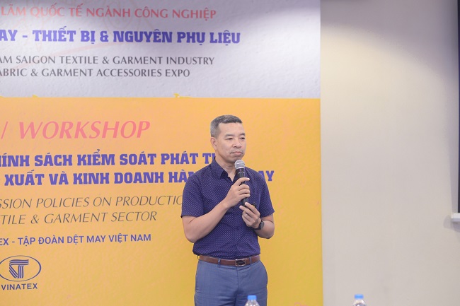 Hội thảo cũng nghe ông Vương Đức Anh- Chánh Văn phòng Hội đồng quản trị Vinatex chia sẻ về chiến lược của EU cho ngành Dệt May bền vững và tuần hoàn. Theo ông Vương Đức Anh, sản xuất trong ngành Dệt May bao gồm cả trồng bông, sử dụng khoảng 93 tỷ mét khối nước/năm và chiếm 4% lượng khai thác nước ngọt trên toàn thế giới. 20% ô nhiễm nước công nghiệp toàn cầu là phát sinh từ các hoạt động xử lý hàng dệt nhuộm. Đồng thời ngành Dệt May đã phát thải 3.3Gt khí CO2 quy đổi và chiếm 6,7% tổng phát thải này của toàn cầu. Sản xuất hàng dệt may toàn câu tăng gần gấp đôi từ năm 2000 – 2015, tiêu thụ quần áo và giày dép dự kiến sẽ tăng 63% vào 2030. Tại EU, tiêu thụ hàng dệt may hầu hết được nhập khẩu, hiện đang có tác động tiêu cực đứng thứ 4 đối với môi trường và biến đổi khí hậu, đứng thứ 3 đối với việc sử dụng nước và đất. Do đó, ngành dệt may có ý nghĩa kinh tế và có thể đóng một vai trò quan trọng trong ngành kinh tế tuần hoàn. Bên cạnh đó, ông Vương Đức Anh cũng đã chia sẻ về cách định giá carbon của các quốc gia trên thế giới bao gồm hệ thống trao đổi giấy phép phát thải (Emission Trading System-ETS) và đánh thuế carbon, đồng thời giới thiệu về thuế biên giới carbon của EU và tác động có thể có đối với lĩnh vực dệt may, mặc dù dệt may chưa phải lịch vực được EU áp thuế biên giới carbon trong giai đoạn áp dụng chuyển tiếp 2023-2025. Tuy nhiên EU cũng có công cụ khác để đạt mục tiêu giảm phát thải carbon cho lĩnh vực dệt may – một trong những ngành có tác động lớn đến môi trường của EU. Một trong những công cụ EU sử dụng để giảm carbon thải ra của lĩnh vực dệt may được thể hiện qua Chiến lược dệt may bền vững và tuần hoàn của EU vừa đưa ra vào 30/3/2022.