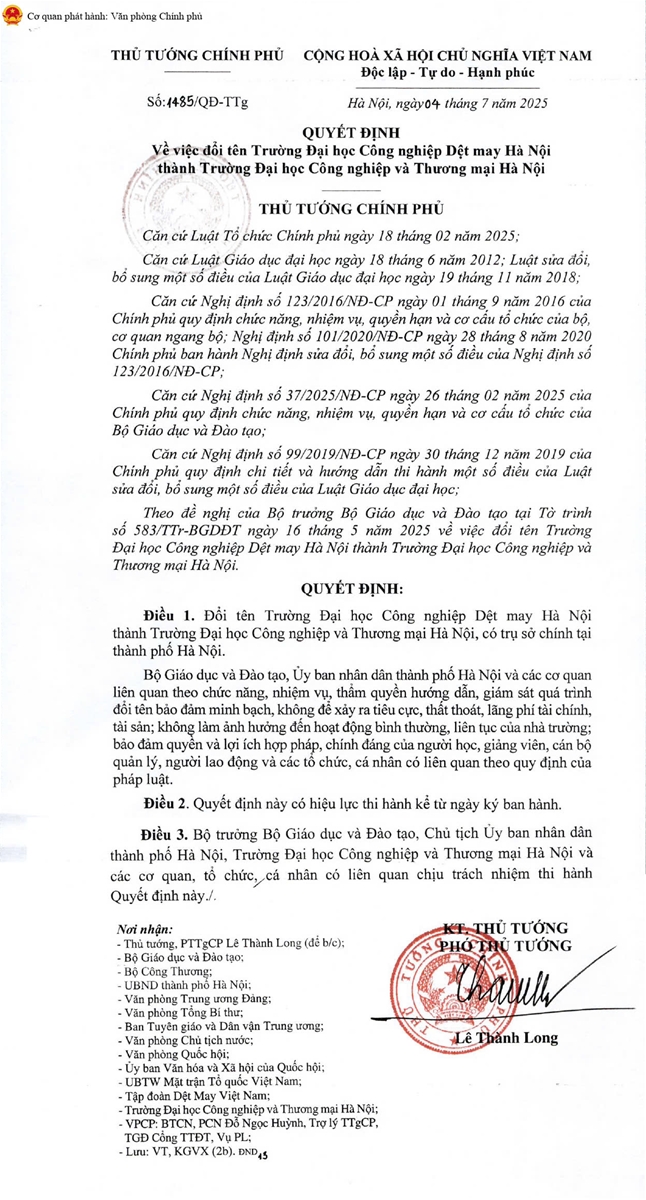 Quyết định của Thủ tướng Chính phủ v/v đổi tên Trường Đại học Công nghiệp Dệt May Hà Nội thành Trường Đại học Công nghiệp và Thương mại Hà Nội